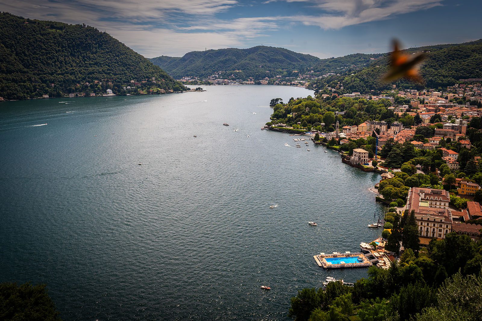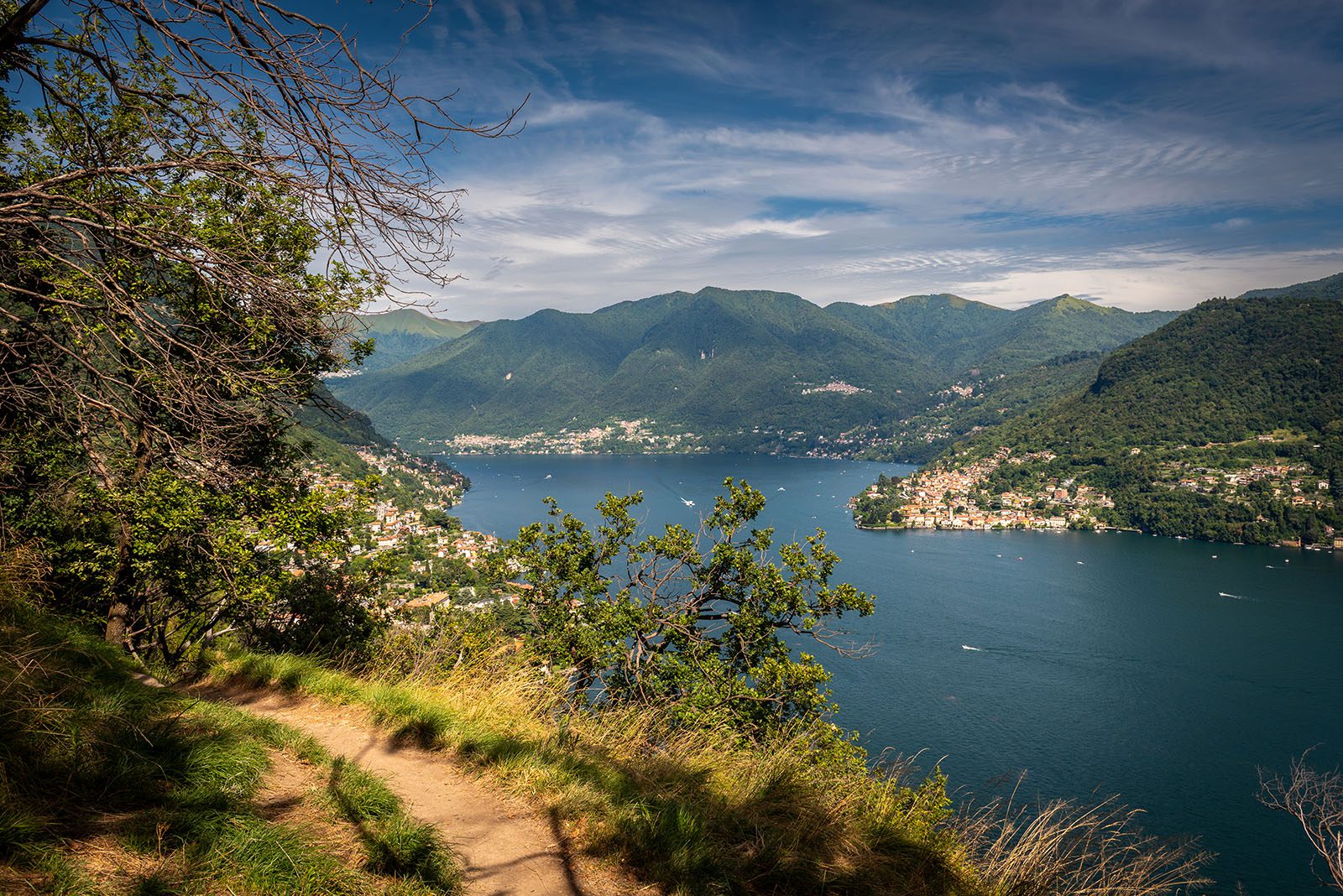 De route loopt volledig parallel met het Comomeer en vormt een eindeloos balkon met een mooi uitzicht op Torno en wanneer je achterom kijkt op Como. Er zit zo’n 200 meter hoogteverschil tussen het wateroppervlak en Sentée di Sort. De vele motorbootjes onder ons zien we nog wel maar horen we niet meer. Rust en stilte met af en toe een watervliegtuigje van Aero Club Como dat brommend voorbij vliegt. We stappen parallel met de westelijke arm van het Comomeer waardoor de ruimte en de uitgestrektheid van het Comomeer benadrukt wordt. Links de Monte Bisbino en rechts het Comomeer: een groen- en blauw kleurenpallet met penseelstrepen van kleurrijke dorpjes.