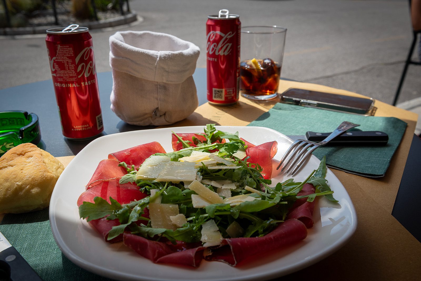 De zon schijnt en het wordt puffen en zweten op de warme asfaltbaantjes die best pittig naar boven slingeren. Het energiepeil kan een boost gebruiken net wanneer een bordje Bar Azzurro onze aandacht trekt. Vijf minuutjes later verfrissen we ons met een ijskoude cola. De keuken is dicht maar er wordt toch nog een eenvoudig bordje bresaola getoverd.