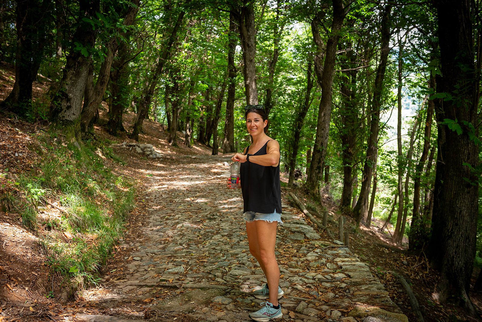 Het eerste stuk van de wandeling loopt langs warme asfalt die pittig omhoog gaat. Hoe hoger we gaan, hoe ruwer de façades van de huizen worden. Waar beneden een oude man secuur zijn metalen omheining van z’n villa met zwarte verf retoucheert wordt boven in een bescheiden huisje hout gekliefd om in de winter de stoof te laten branden. Rust en stilte, een ietwat gesloten sfeertje vallen ons op. Geleidelijk aan wordt het baantje smaller en verslechtert het asfalt. Het favoriete terrein van de panda, die met 4×4 wel te verstaan. De bomen zijn gul met welgekomen schaduw. Uiteindelijk wordt het baantje een wandelpad dat door de beboste heuvels loopt.