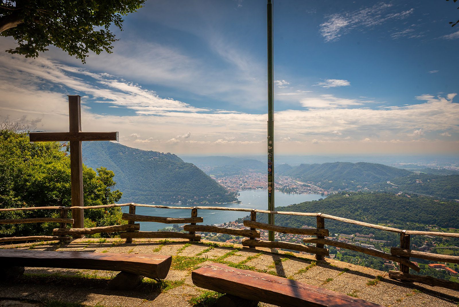 Vanop het balkon hebben we inderdaad een prachtig uitzicht op de stad Como en het Comomeer. Aan de overzijde van het water zien we wat hogerop de Faro Voltiano in Brunate. Deze plek maakt deel uit van de Monti di Duello en Monti di Piazzola. In de verte tekenen de Alpen zich af tegen de horizon. Ook de Po-vlakte kan je hier net nog zien. Aan de rechterkant ligt Zwitserland. Onder ons zien we de auto’s aanschuiven aan de grenspost van Chiasso. File natuurlijk, juist het is augustus. We rusten even uit op de houten banken en genieten van de stilte.