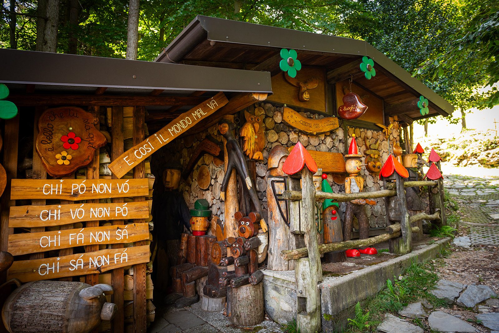 Het groene grasveldje nodigt uit voor een picknick of een aperitief bij zonsondergang. Crocce Dell’ Uomo wordt duidelijk actief onderhouden. Uit hout gesneden bloembakken, een kastje met leesboeken en in hout gekerfde spreuken en poëzie. Achter het kapelletje vind je in het bos allerlei houtsnijwerk. Het is het werk van kunstenaar Giosuè Aramini. Hij maakt er een “bosco saggio” van. In het wijze bos kan je opvallende figuren in kastanjehout vinden zoals Pinocchio, een egel, een slak en een haan. De spreuken zijn cliché of verrassend reflectief zoals een citaat van Oscar Wilde of onze verhouding tot de natuur. Het geeft alleszins leuke en creatieve twist aan deze wandeling.