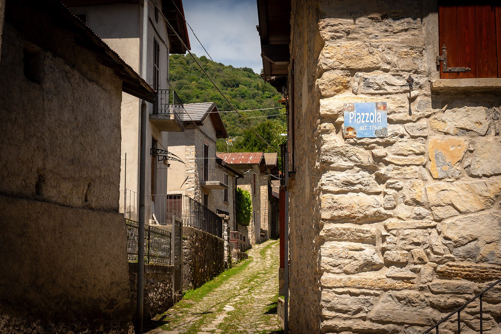 We hebben een stevige portie panorama genoten. Tijd om verder te wandelen. De route loopt nog verder door naar een klein gehuchtje Piazzola waar geen levende ziel te bespeuren valt, op die ene panda na. We maken een u-turn en beginnen aan de afdaling door de bossen. Het dalen gaat vlot langsheen de verschillende shortcuts. We keren slechts beperkt op onze stappen terug.